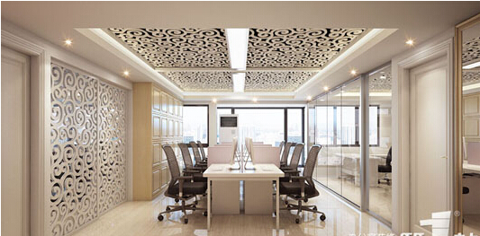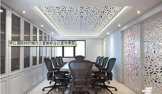 就是新的元素和中式的元素的巧妙地結(jié)合,采用了沉穩(wěn)的裝修路線,還有雕刻的天花造型和高隔斷等等。這是該紡織城辦公室裝修的案例中它的會(huì)議區(qū)的裝修,以此來(lái)表現(xiàn)企業(yè)的高大的形象,這很精致。