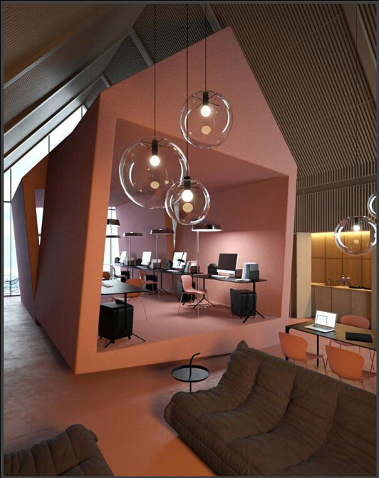 設計師把這里的吊燈用透明泡泡的玻璃罩來裝飾它的外表,此次辦公室裝修設計用了邊角料的來美化室內的辦公環境,藝術魅力很強烈的辦公室裝修設計是有很強烈的感染力的作品,這是一個開放式的空間設計手法,增強了藝術的氣氛。